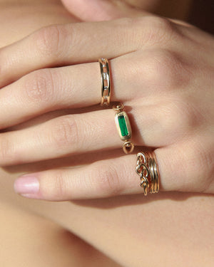 This piece is handmade locally in New York, using responsibly-sourced Colombian emerald and 100% recycled gold which supports the communities at the source of our materials.